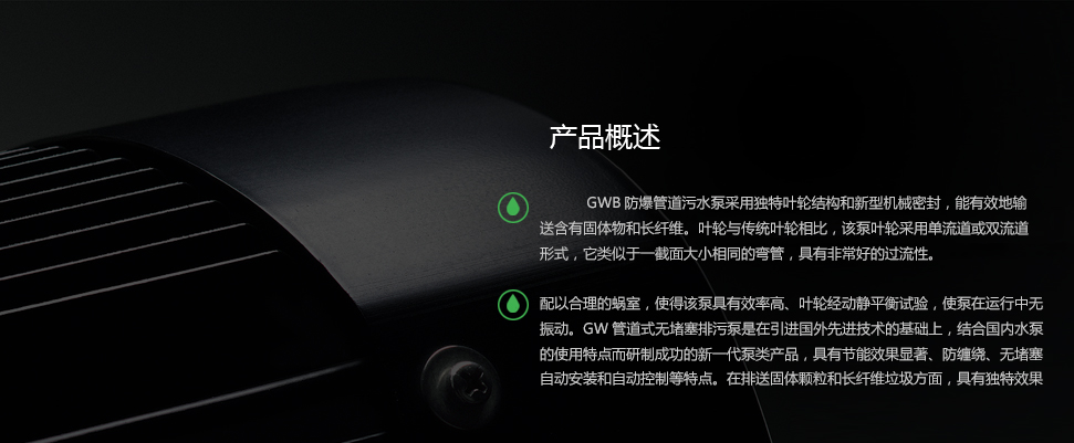 GWB防爆化工管道污水泵是在引進(jìn)國外先進(jìn)技術(shù)的基礎(chǔ)上,結(jié)合國內(nèi)水泵的使用特點(diǎn)而研制成功的新一代泵類產(chǎn)品,具有節(jié)能效果顯著、防纏繞、無堵塞、自動安裝和自動控制等特點(diǎn)。在排送固體顆粒和長纖維垃圾方面,具有獨(dú)特效果