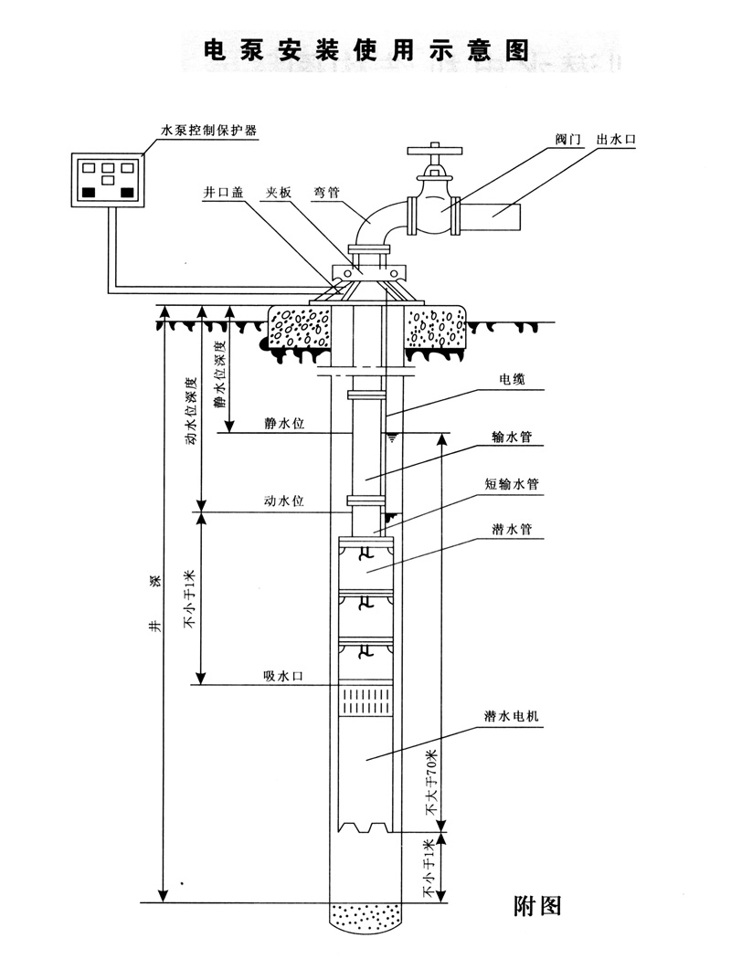 1.QJ型深井潛水泵機組由:水泵、潛水電機(包括電纜)、輸水管和控制開關四大部分組成。潛水泵為單吸多級立式離心泵:潛水電機為密閉充水濕式、立式三相鼠籠異歩電動機,電機與水泵通過爪式或中.鍵筒式聯軸器直接;配備有不同規格的三芯電纜:起動設備為不同容量等級的空氣開關和自耦減壓起動器、輸水管為不同直徑的鋼管制成,采用法蘭聯接,高揚程電泵釆用閘閥控制。