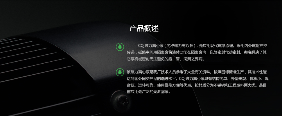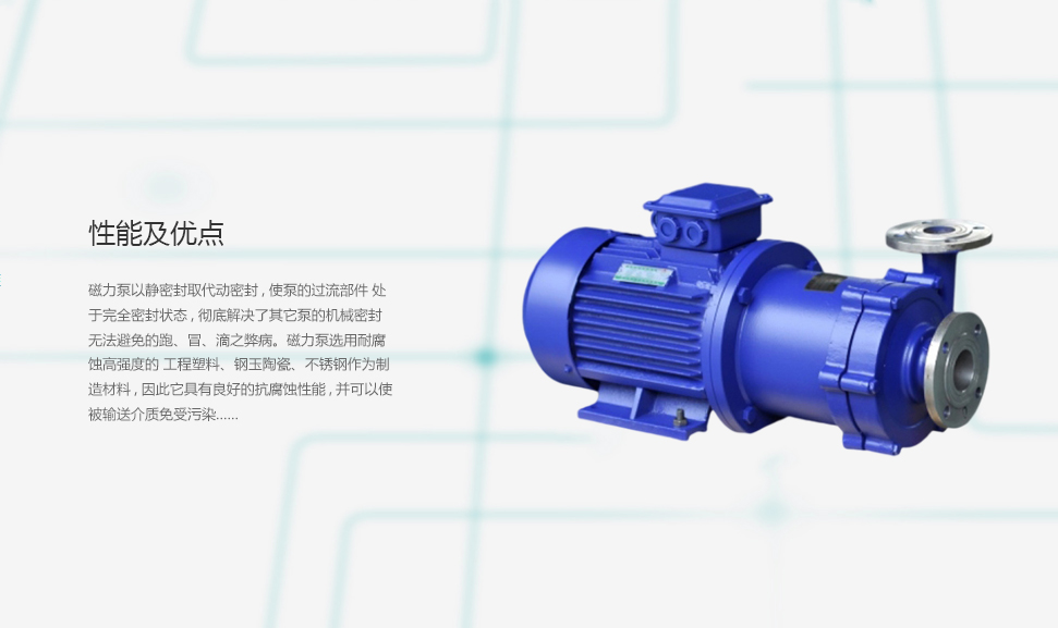 磁力泵結構緊湊,外形美觀,體積小,噪音低,運行可靠,使用維修方便??蓮V泛用于化工、制藥、石油、電鍍、食 品、國防、科研機構、冶金、染料等單位抽送酸、堿液、油類稀有貴重液、毒液、揮發性液體,以及循環水設備 配套、過濾機配套。特別是易漏、易,燃、易爆液體的抽送。防爆電動機選用此泵則更為理想設備。