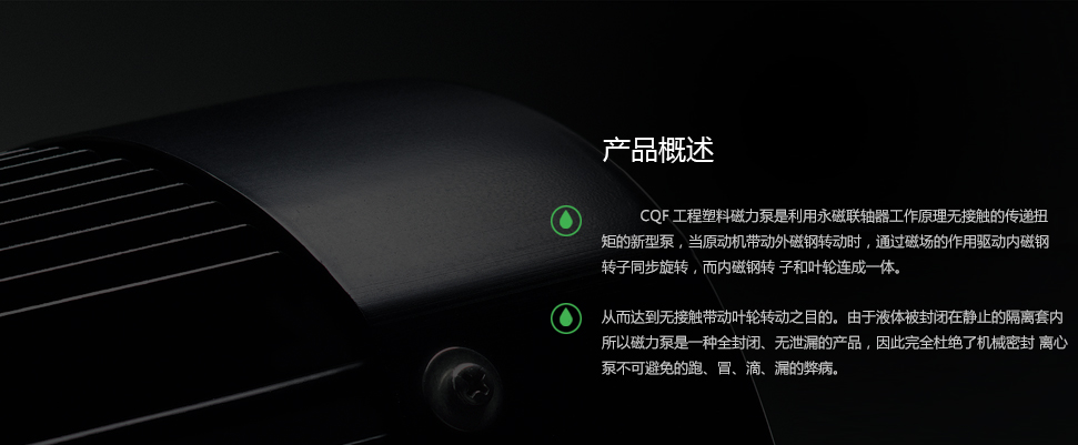 CQF系列磁力工程塑料離心泵是利用永磁聯(lián)軸器工作原理無接觸的傳遞扭矩的新型泵,當(dāng)原動(dòng)機(jī)帶動(dòng)外磁鋼轉(zhuǎn)動(dòng)時(shí),通過磁場(chǎng)的作用驅(qū)動(dòng)內(nèi)磁鋼轉(zhuǎn)子同步旋轉(zhuǎn),而內(nèi)磁鋼轉(zhuǎn) 子和葉輪連成一體,從而達(dá)到無接觸帶動(dòng)葉輪轉(zhuǎn)動(dòng)之目的。由于液體被封閉在靜止的隔離套內(nèi),所以磁力泵是一種全封閉、無泄漏的產(chǎn)品,因此完全杜絕了機(jī)械密封 離心泵不可避免的跑、冒、滴、漏的弊病。